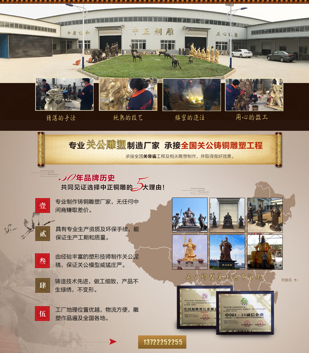 河北中正銅工藝品制造有限公司是一家具有獨立設計、雕塑、鑄造、制作施工能力的單位。擁有完善的,大型的,先進的生產設備,并由多位經驗豐富的高級鑄造技師指導生產及制作。公司主要鑄造銅關公,九龍銅關公,福建銅關公,臺灣銅關公,關羽雕塑,鑄銅關公,銅雕關公,1米銅關公,2米銅關公等,可按客戶提供動物銅雕圖片訂做加工銅關公,九龍銅關公,做工精美,質量保證。